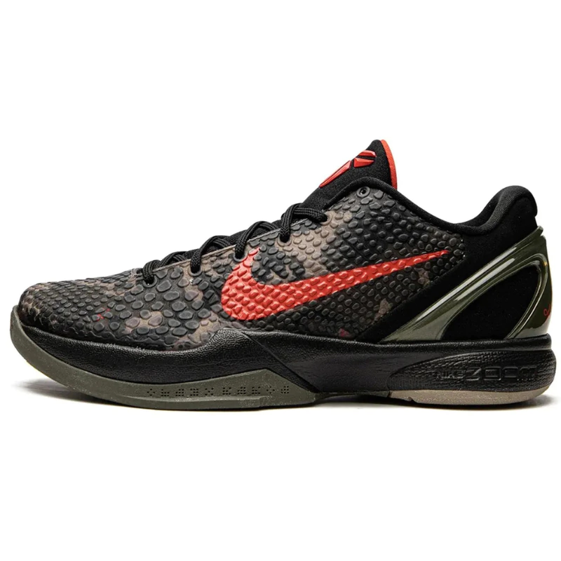 O Kobe 6 "Italian Camo" é uma edição especial que combina performance de alto nível com um visual tático e sofisticado. Com um padrão camuflado em tons de verde, marrom e preto, o design é inspirado no tempo que Kobe Bryant passou na Itália durante sua infância — uma homenagem às suas origens e à sua formação internacional no basquete.